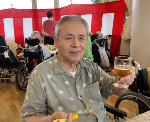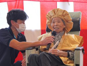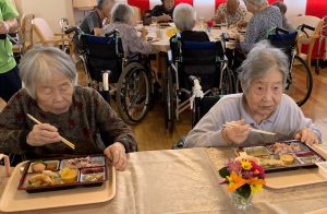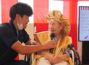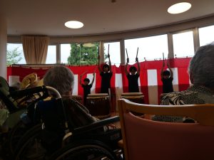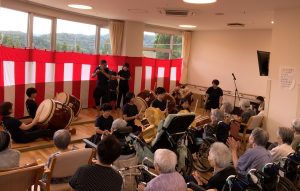 9月13日に敬老会を行いました。お昼に寿弁当を召しあがった後は、百寿を迎えた方の紹介とうらだ屋太鼓様による太鼓の演奏を聴きました。地元の小中学生と大人が奏でる太鼓演奏はとても力強く、会場内には迫力のある和太鼓のリズムが響き渡り、ご利用者様と同席されたご家族の皆様、とても喜ばれていました。