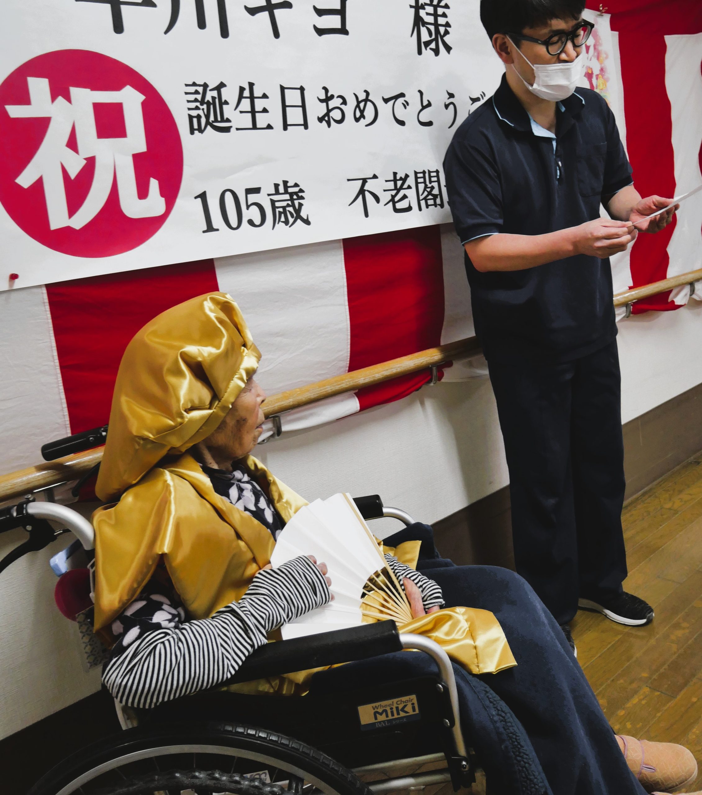 105歳は不老閣特養ご利用者の歴代最高齢ということで、ご長寿を記念して施設内に横断幕を飾らせていただきました。ちなみに、大正から昭和、平成、令和と4つの時代を生きている105歳以上の方は日本人の割合では2万人に1人だそうです。年齢を重ねるごとに、表情に人柄や人生が現れるといいますが、いつも和やかで素敵な笑顔のK様、こんな風に年を重ねていけたら良いなと思わせる、人生の大先輩です。これからも元気でお過ごしください。よろしくお願いします。