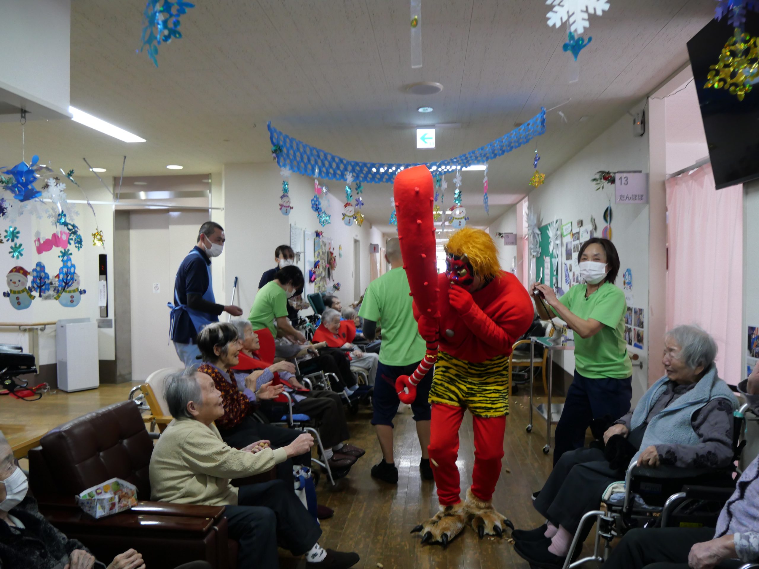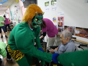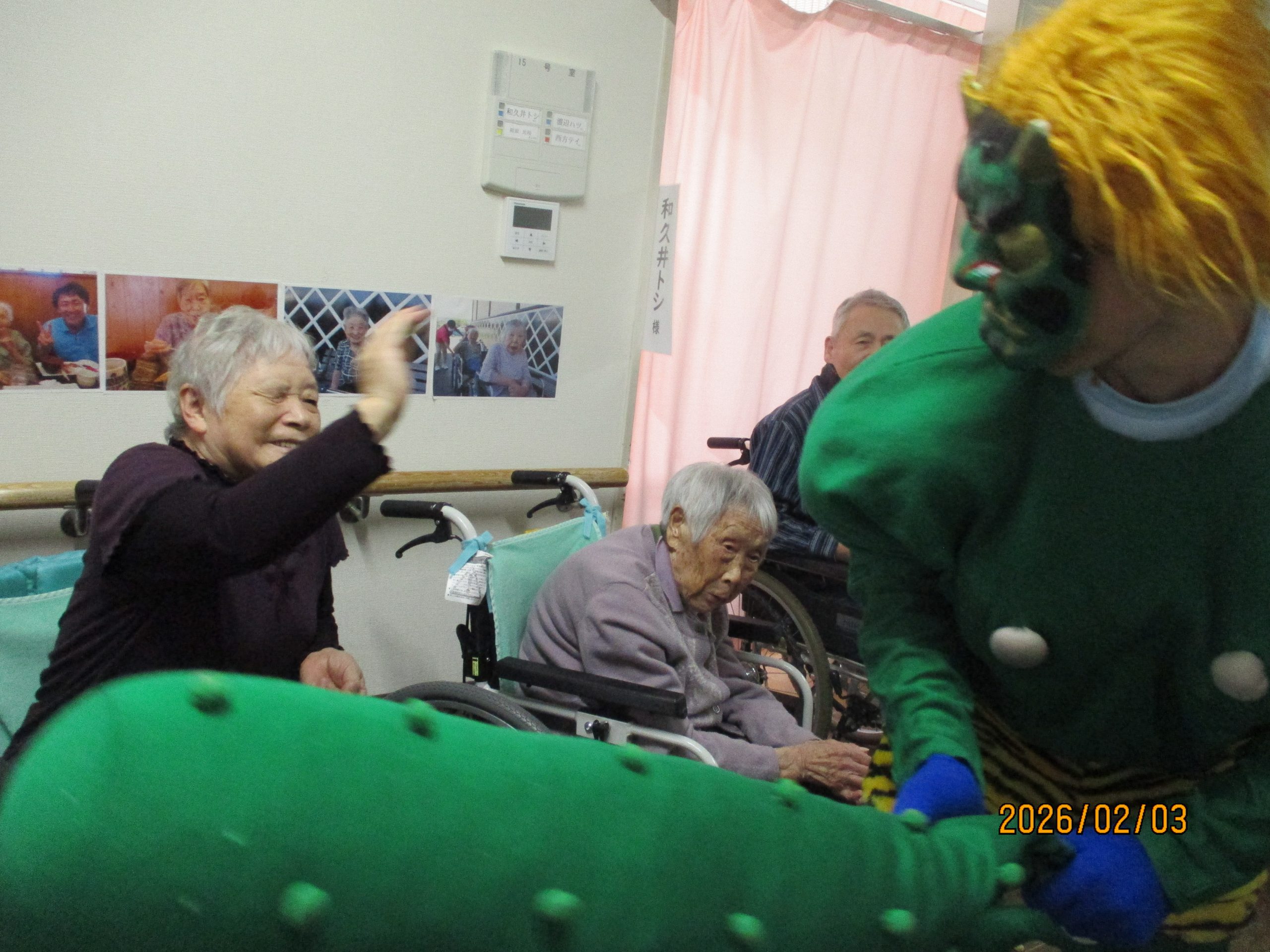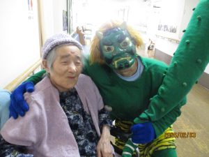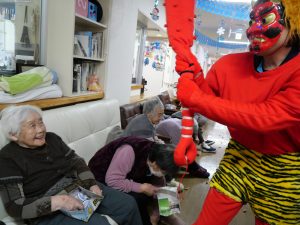 「鬼は~外」の掛け声とともに、職員とご利用者の皆で一斉に落花生を投げて、2体の鬼は山へ帰っていきました。